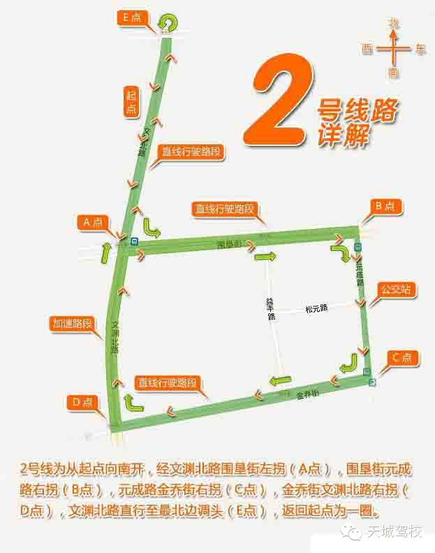 1號線為從起點向南開,經(jīng)文淵北路圍墾街直行(A點),文淵北路金喬街左拐(B點),金喬街元成路左拐(C點),元成路圍墾街左拐(D點),圍墾街文淵北路右拐(A點),文淵北路直行至最北邊調頭(E點),返回起點為一圈。